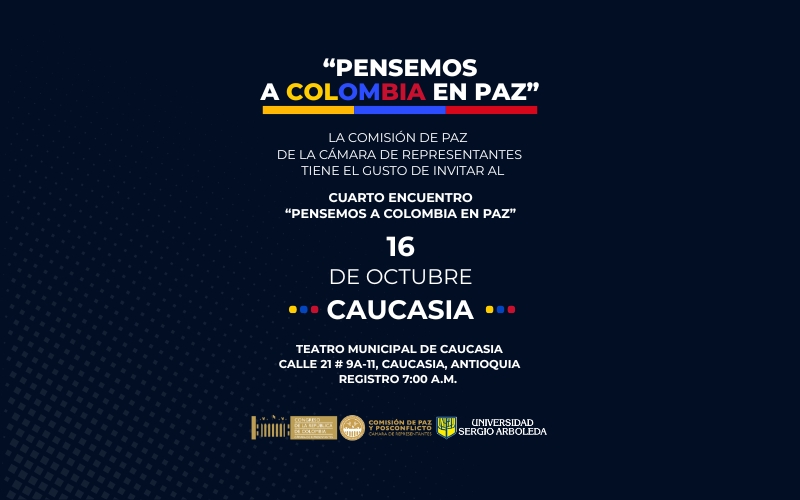 Medellín (Antioquia), 10 de octubre de 2025 (Prensa Cámara). La Comisión Legal de Paz y Posconflicto de la Cámara de Representantes, creada a finales del año pasado, desarrollará el cuarto encuentro regional ‘Pensemos a Colombia en Paz’, el próximo jueves 16 de octubre en la ciudad de Caucasia (Antioquia) con el fin de recoger las propuestas ciudadanas en torno al futuro de la paz de su región y del país.