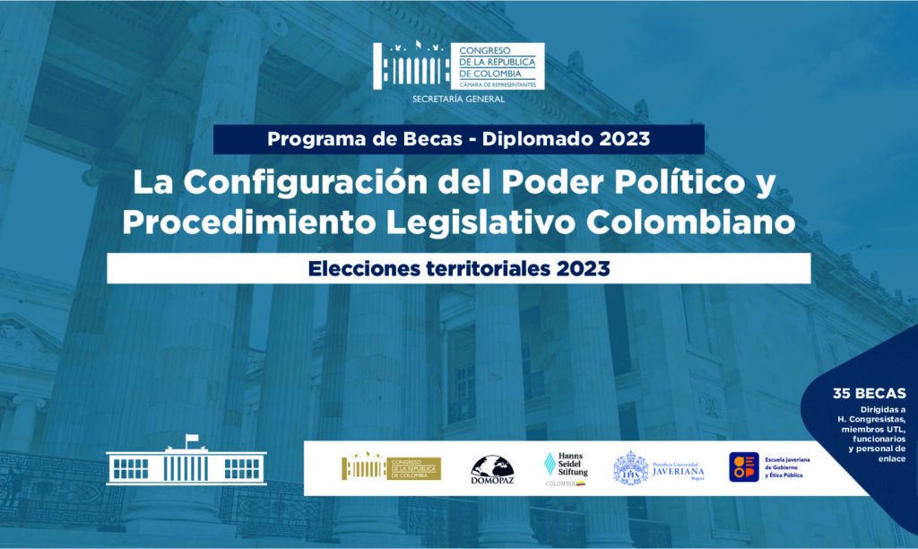 Fecha de inicio: julio 24 de 2023 PROGRAMA DE BECAS La Secretaría General de la Cámara de Representantes, la Fundación Domopaz y Hanns Seidel Stiftung en alianza con la Pontificia Universidad Javeriana, se complacen en anunciar la apertura de la convocatoria de becas 2023 para el diplomado en formación legislativa: " La Configuración del poder político y el procedimiento legislativo colombiano". El objetivo de este programa es actualizar y proporcionar al participante, herramientas teóricas y prácticas para mejorar sus habilidades y conocimientos en el trabajo legislativo en el Congreso de la República, el presupuesto general de la nación, el plan de desarrollo, entre otros temas de relevancia nacional. Este programa está dirigido a los honorables congresistas o a uno de sus asesores de la UTL también se pueden postular funcionarios de Cámara de Representantes, Senado de la República y personal de enlace con el Congreso . El cupo es limitado a 35 plazas con beca de hasta del 90%, las cuales serán asignadas con prioridad a los Honorables Congresistas y por orden de inscripción y cumplimiento de los requisitos exigidos. Para mayor información sobre el proceso de inscripción y beneficio de beca, podrán comunicarse con la Fundación Domopaz al correo contacto@domopaz.org CONTENIDO: · Elementos para la configuración del poder político. · Sistema electoral colombiano, marketing político y elecciones territoriales 2023. · Procedimiento legislativo, trámite, formación de la ley y de los actos legislativos. · Responsabilidad de los servidores públicos, régimen de inhabilidades, incompatibilidades y conflicto de interés. Ética. · Técnica legislativa, elementos ontológicos y epistemológicos de la ley. · Control político y preparación de debates. Formulario de inscripción: https://forms.gle/zj4Vfde38iNuW3Cx8 Descargue el brochure Informativo Brochure diplomado legislativo 2023 V7.pdf