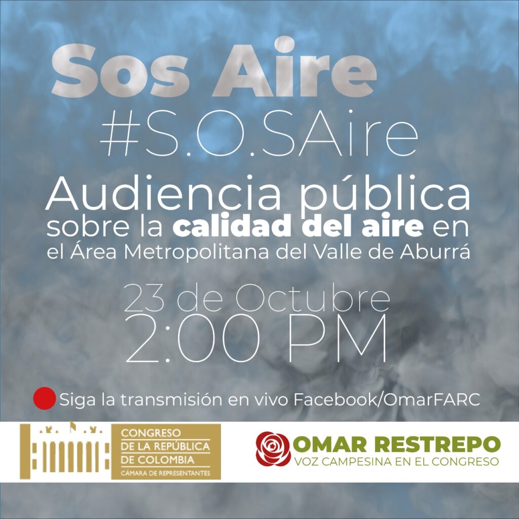 Invitación a todos los medios de comunicación a participar y realizar cubrimiento la Audiencia Pública virtual: “Calidad del aire en el Valle de Aburrá y sus afectaciones a la salud pública”, a desarrollarse el viernes 23 de octubre a partir de las 2 AM en la sesión plenaria de la Cámara de Representantes. En la audiencia pública esperamos contar con la participación de las comunidades de Belén e Itagüí afectadas por las ladrilleras, los vecinos de la Planta de Tratamiento de Aguas Residuales de Bello que no soportan los olores “ofensivos”, los amantes de la movilidad en bicicleta, los defensores del arbolado urbano “Túnel Verde”, el colectivo Más Consciencia de Girardota con su problema de chimeneas o fuentes fijas, entre otros colectivos y movimientos defensores de una mejor calidad del aire para el Valle de Aburrá. De igual manera, en este espacio buscamos escuchar voces de expertos y profesionales defensores del aire limpio como los profesores Elkin Martínez y Pablo Montoya, la profesora Catherine Vieira, los abogados Cristian Zapata y Luis Guillermo Mesa, entre otros. Además, se invitarán diferentes autoridades del Estado para que den respuesta a los planteamientos presentados. Esta Audiencia se realizará por la plataforma meet por lo que es necesario confirme su participación al correo esteban.gomez@camara.gov.co o al WhatsAPP 310 775 71 33.