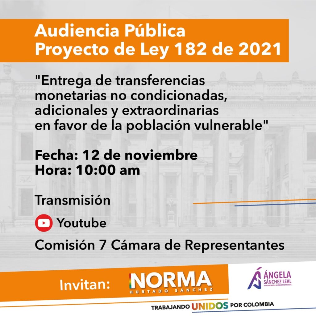 Esta iniciativa busca extender las entregas de transferencias monetarias no condicionadas, adicionales y extraordinarias en favor de los beneficiarios de los programas Protección Social al Adulto Mayor- Colombia Mayor, Familias en Acción y Jóvenes en Acción más allá del término de duración de los efectos de la Emergencia Económica, Social y Ecológica. Fuente: Oficina de Comunicaciones Representante Norma Hurtado