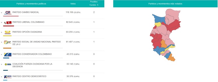Fuente: Con información de Registraduría Nacional. El partido Cambio Radical resultó ganador en el departamento del Magdalena en las elecciones legislativas tras obtener dos curules de las cinco que corresponden a ese departamento. José Luis Pinedo (23.331 votos) y Carlos Mario Farelo (56.628 votos), se estrenan en la Cámara de Representantes a partir del 20 de julio e integrarán el grupo de Cambio Radical en esa Corporación que suma un total de 30 legisladores. Las otras tres curules de Magdalena en la Cámara corresponderán a Hernando Guida (29.397 votos) de la U, quien también debuta como congresistas la liberal Kelyn Johana González (52.385 votos) y Franklin del Cristo Lozano (48.107) de Opción Ciudadana, quienes resultaron reelegidos. Magdalena José Luis Pinedo (Cambio Radical) Carlos Mario Farelo (Cambio Radical) Hernando Guida (La U) Kelyn Johana González (Partido Liberal) Franklin del Cristo Lozano (Opción Ciudadana)