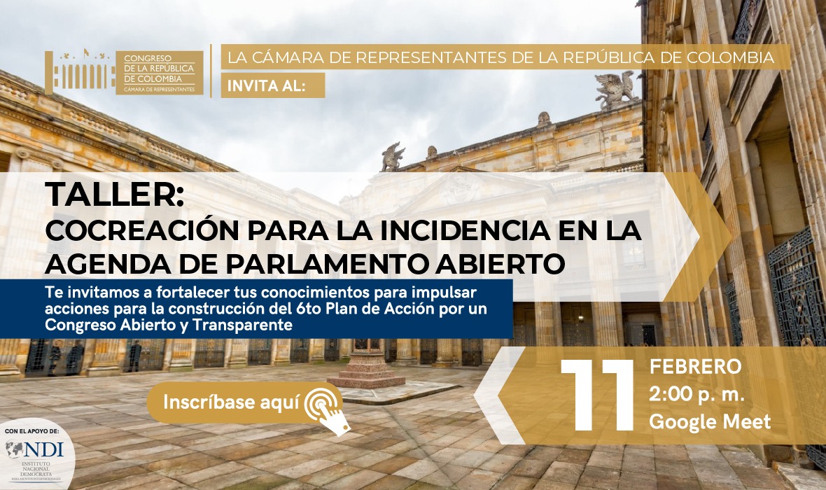 La Cámara de Representantes le invita a participar del TALLER: COCREACIÓN PARA LA INCIDENCIA EN LA AGENDA DE PARLAMENTO ABIERTO, el cual busca fortalecer los conocimientos para impulsar acciones para