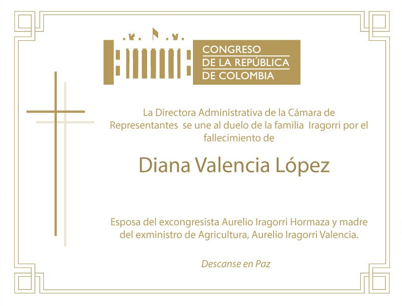 La Directora Administrativa de la Cámara de Representantes lamenta el fallecimiento de Diana Valencia López, esposa del exsenador Aurelio Iragorri Hormaza y madre del exministro de Agricultura, Aurelio Iragorri Valencia.