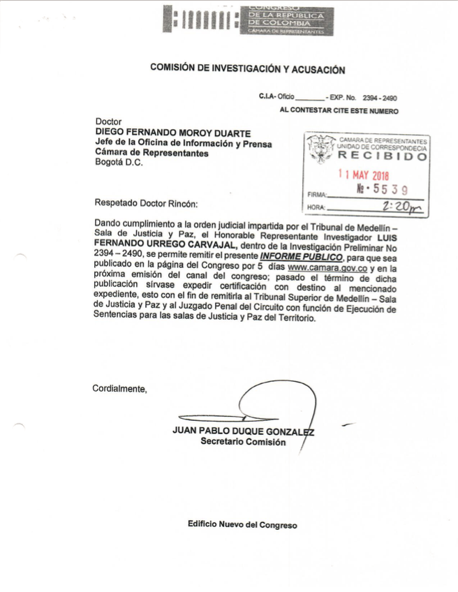 Por orden judicial del Tribunal de Medellín, el representante investigador, Luis Fernado Urrego Carvajal, hizo público un informe de la investigación que cursa en la Comisión de Acusaciones en contra