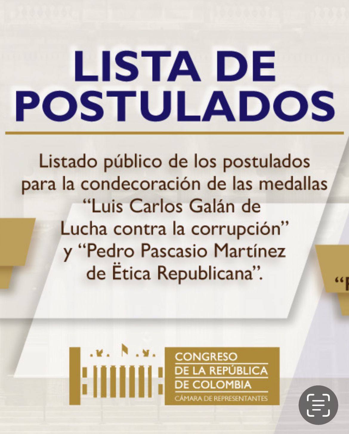 Las Comisiones de Ética del Congreso, hacen pública la lista de personas postuladas a las medallas “Luis Carlos Galán de lucha contra la corrupción” y “Pedro Pascasio Martínez de ética