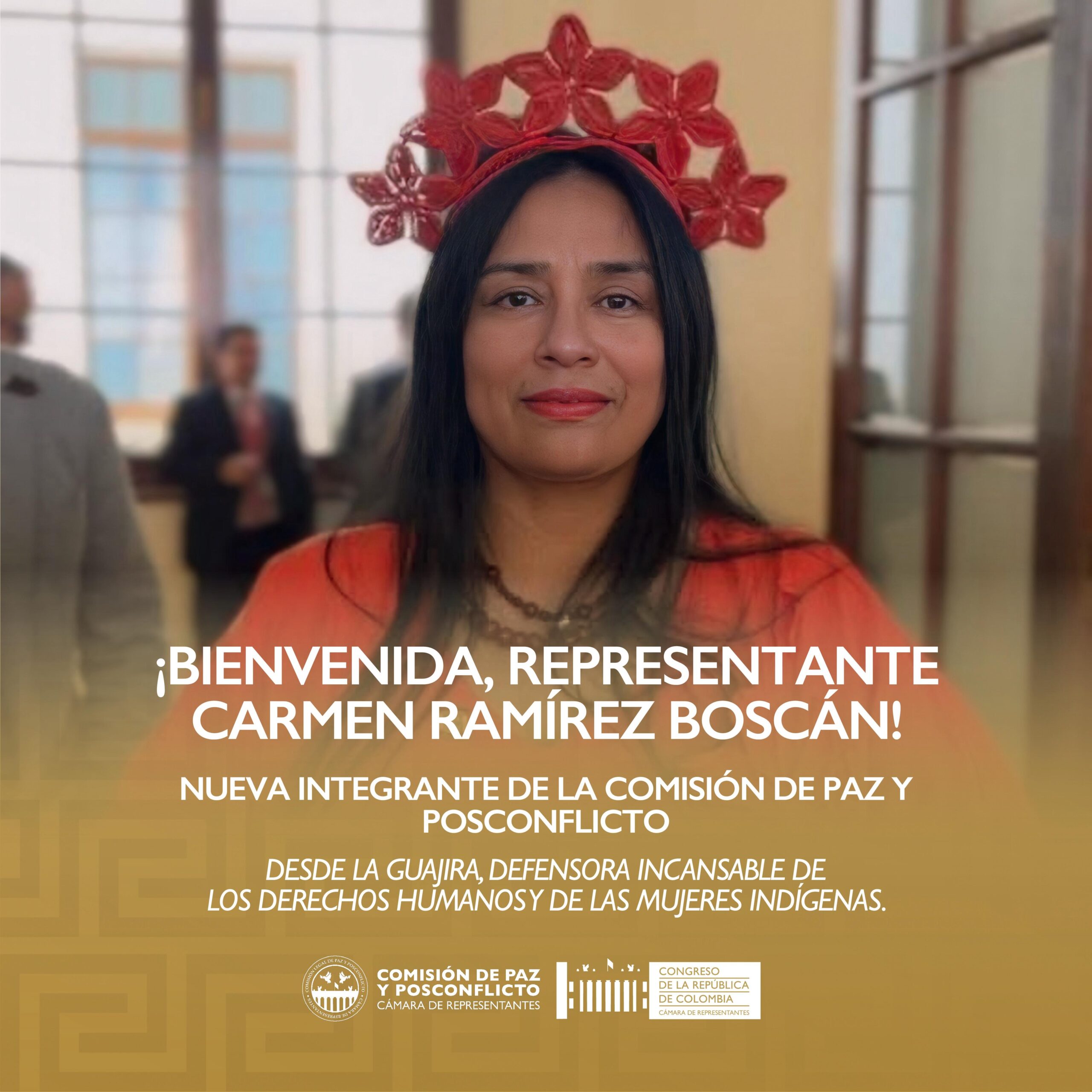 Bienvenida, Representante, Carmen Felisa Ramírez Boscán. Fecha 3 de septiembre de 2025 (Prensa Cámara). Mediante proposición aprobada por la Plenaria de la Cámara llega a la Comisión de Paz y