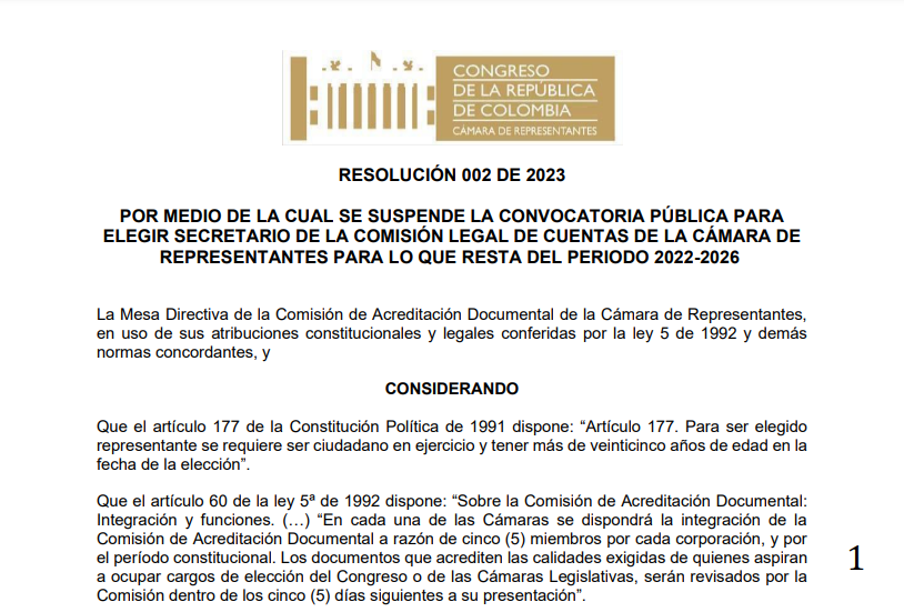 «La Mesa Directiva de la Comisión de Acreditación Documental de la Cámara de Representantes suspende de manera transitoria la Convocatoria para la elección del cargo de Secretario de la Comisión