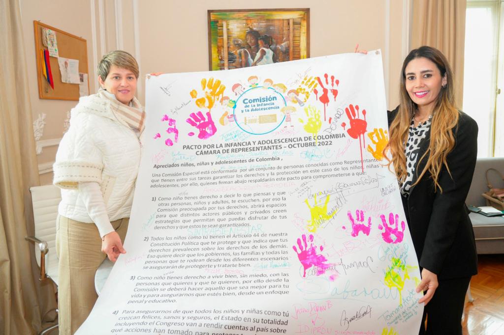 Trabajar por los derechos de los niños, niñas y adolescentes para que puedan crecer en entornos protectores donde se les respeten sus derechos fue el compromiso pactado entre la primera dama de la Nación Verónica Alcocer y la Segunda Vicepresidenta de la Oposición de la Cámara Erika Tatiana Sánchez Pinto. Durante un encuentro que se llevó a cabo en la Casa de Nariño, la Primera Dama firmó el Pacto por la Infancia y Adolescencia de Colombia, al cual también ya se habían unido congresistas de todos los partidos políticos y regiones del país e instituciones públicas y privadas que trabajan en pro de la niñez. Para la Segunda Vicepresidenta de la Cámara y Presidenta de la Comisión Accidental de Infancia y Adolescencia, el apoyo de la Dra. Verónica Alcocer es fundamental para formalizar una ruta de trabajo y construir diversas iniciativas que le permitan a la niñez y la adolescencia tener una voz permanente en el Congreso de la República y en el Gobierno Nacional. “Las luchas por las garantías de los derechos los niños, niñas y adolescentes en Colombia han logrado un significativo avance en la cobertura de sus necesidades y el despliegue institucional que hay en el país, sin embargo, todavía como sociedad tenemos muchas deudas con ellos para lograr que vivan sus ciclos de vida con mejores oportunidades”, indicó la Representante. Uno de los puntos primordiales para lograr sacar adelante proyectos y programas dirigidos a mejorar sus condiciones de vida y garantizar el goce efectivo de sus derechos, teniendo en cuenta lo que establece la constitución en su artículo 44*, es lograr que la Comisión de la Infancia y Adolescencia deje de ser accidental y se convierta en un escenario permanente de edificación colectiva. La Congresista hace un llamado e invitación a todos los actores interesados en las luchas por los niños, niñas y adolescentes a que se vinculen al desarrollo del plan de trabajo que será desarrollado en el seno de la Comisión de Infancia y Adolescencia para construir una Colombia con la mirada puesta en el futuro de nuestros niños. *“Son derechos fundamentales de los niños: la vida, la integridad física, la salud y la seguridad social, la alimentación equilibrada, su nombre y nacionalidad, tener una familia y no ser separados de ella, el cuidado y amor, la educación y la cultura, la recreación y la libre expresión de su opinión”.