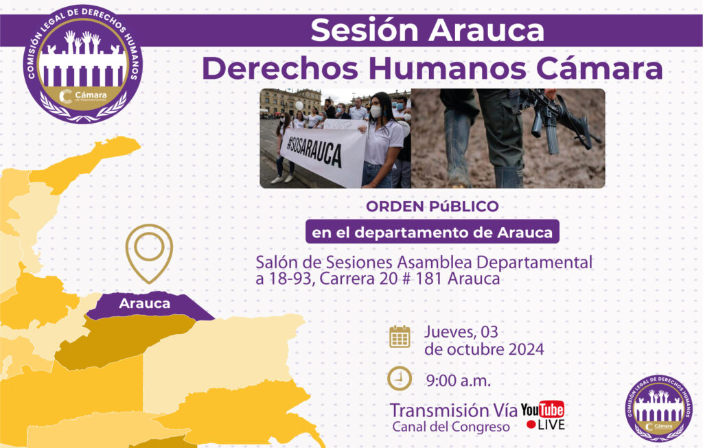 Se analizarán las serias alteraciones del orden público que han suscitado una profunda preocupación y angustia entre los habitantes. Esta sesión tiene como objetivo de manera integral la crítica problemática de seguridad que enfrenta la región, se contará con la participación de la doctora Iris Marín Ortiz, Defensora del Pueblo, por las Fuerzas Militares, se contará con el Mayor General Olveiro Pérez Mahecha, Jefe del Estado Mayor de Planeación y Políticas del Ejército Nacional, el Brigadier General, José James Roa Castañeda¸ Comandante Regional de Policía Número 5, los ministerios de Defensa Nacional y del Interior, la Oficina del Alto Comisionado para la Paz y la Procuraduría General de la Nación entre otros. Los temas a tratar incluirán los recientes atentados, secuestros y el alarmante incremento de homicidios, especialmente en contra de líderes sociales, así como otros hechos que ponen en grave riesgo la vida y el bienestar de la comunidad araucana, proponer soluciones efectivas, escuchar a las víctimas y actores locales, con el fin de enfrentar esta crisis de manera coordinada y efectiva. Fecha: Jueves 3 de octubre de 2024 Hora: 9:00 A.M. Lugar: Salón de sesiones Asamblea Departamental Fuente: Prensa Comisión de Derechos Humanos y Audiencias Cámara de Representantes
