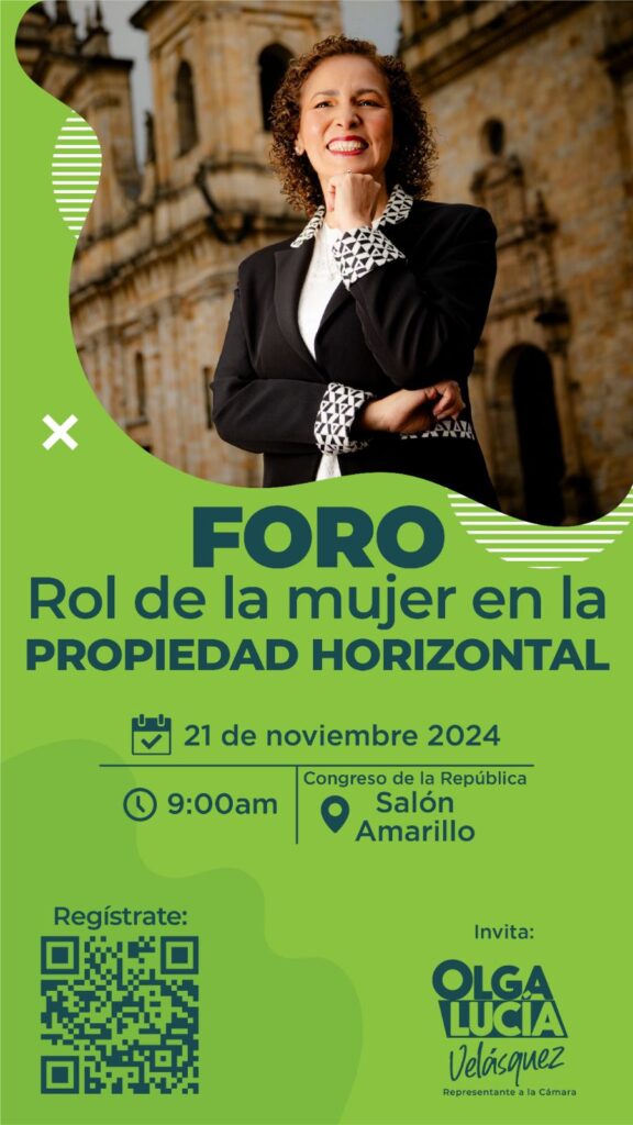 Bogotá se alista para un diálogo transformador sobre liderazgo femenino y propiedad horizontal Bogotá, 20 de noviembre de 2024 (Prensa Cámara). Este jueves 21 de noviembre de 2024, a partir de las 9:00 a.m., el Congreso de la República será el escenario del Foro: El Rol de la Mujer en la Propiedad Horizontal, un evento de alto impacto que busca destacar y promover el liderazgo de las mujeres en la gestión y administración de la Propiedad Horizontal en Colombia. Organizado por la Representante a la Cámara Olga Lucía Velásquez, este espacio reunirá a voces clave en el ámbito político, académico, empresarial y social para debatir desafíos, compartir buenas prácticas y visibilizar el papel crucial de las mujeres en este sector. El foro contará con la participación de reconocidas entidades como el Ministerio del Interior, la Fiscalía General de la Nación, la Secretaría de Hábitat, la Secretaría de Gobierno, y el IPAC, entre otras organizaciones comprometidas con la construcción de políticas inclusivas y equitativas. En un país donde la participación femenina en sectores estratégicos sigue siendo un desafío, este foro busca no solo visibilizar la gestión de las mujeres en la Propiedad Horizontal, sino también proponer soluciones concretas que fortalezcan su participación y liderazgo. Será una oportunidad única para compartir experiencias, debatir desafíos y promover políticas que fortalezcan la participación de las mujeres en la gestión de Propiedad Horizontal. Fecha: Jueves, 21 de noviembre de 2024 Hora: 9:00 a.m. Lugar: Salón Amarillo, Congreso de la República Tema central: Liderazgo femenino en la Propiedad Horizontal Inscripción AQUÍ Este foro será una oportunidad única para documentar historias, datos e iniciativas relacionadas con la igualdad de género y la administración eficiente de la Propiedad Horizontal. Contacto: Alejandra Martínez Teléfono: 310 785 9881 Fuente: Oficina de Prensa de la Representante Olga Lucia Velásquez