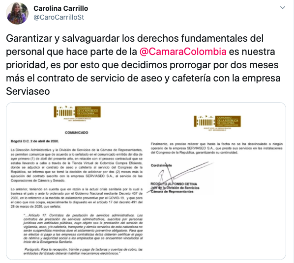 Garantizar y salvaguardar los derechos fundamentales del personal que hace parte de la @CamaraColombia es nuestra prioridad, es por esto que decidimos prorrogar por dos meses más el contrato de servicio de aseo y cafetería con la empresa Serviaseo.