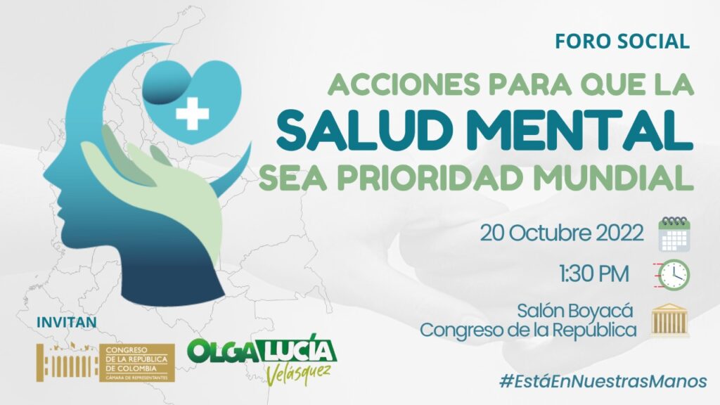 Con la participación de expertos, entidades del orden nacional y distrital, organizaciones, asociaciones del sector salud y ciudadanos, se desarrollará el próximo jueves 20 de octubre el foro nacional: ‘Acciones para que la salud mental sea prioridad mundial’. En concordancia con el lema de la Organización Mundial de la Salud – OMS- para este 2022, el encuentro, impulsado por la Comisión Accidental de Salud Mental de la Cámara de Representantes, abordará el panorama actual, haciendo énfasis en lo que ocurre en el país con respecto a cifras alarmantes del impacto en la vida y el bienestar de los ciudadanos; también, la capacidad de respuesta de los sistemas de aseguramiento y de prestación para la atención integral y lo que ocurre en el ámbito educativo. De acuerdo con cifras de los entes encargados de la vigilancia sobre el asunto, tras la pandemia del Covid-19 y en medio de la reactivación del país, crecieron las problemáticas en torno al estado mental y emocional de los colombianos. Más de 920.000 personas diagnosticadas en el último año con algún síntoma de enfermedad mental, un 70% de jóvenes en el país con alguna afección de este tipo, más de 15.691 intentos de suicidio en el primer semestre de este año, principalmente en población entre los 18 y 39 años. Así mismo, las que entrega el Sistema de Vigilancia en Salud Pública que indica que en Colombia se presenta un suicidio cada 20 minutos, que por lo menos uno de cada 13 fallecimientos de menores de edad está asociado al suicidio, que aproximadamente un 44.5% de adultos mayores en una encuesta del caso aseguran haber tenido ideación suicida por depresión, ansiedad o estrés o que 2.962 personas se quitaron la vida en 2021, según el DANE con un aumento de 8% frente a 2020; y otras más, que convierten la salud mental en un asunto que requiere de reconocimiento, atención, educación, socialización e inversión. “Hay muchas personas hoy con múltiples padecimientos que tocan a todos sin excepción ya sea personalmente, en sus familias o entornos cercanos; es vital recordar que sin salud mental no hay salud, sin salud mental no hay convivencia, no hay paz, porque no hay equilibrio entre cuerpo y mente. Tan grave es el panorama que ya no puede pasar desapercibido, hay que actuar”, manifestó la vicepresidenta de la Cámara de Representantes, Olga Lucía Velásquez. Esta iniciativa que busca involucrar a los actores del sector en un solo propósito, se suma a la reciente radicación del proyecto 236 autoría de la primera vicepresidenta de la Cámara de Representantes, Olga Lucía Velásquez, la representante por Cundinamarca, Liliana Rodríguez y el representante por Boyacá Jaime Raúl Salamanca; respaldado por más de 10 congresistas de otras bancadas para poner como prioridad en la agenda social y de gobierno la atención de calidad en este tema. El evento tendrá lugar en el Salón Boyacá del Congreso de la República a la 1:30 pm, en una convocatoria abierta al público interesado en el tema a través del siguiente link: https://forms.gle/JaZoToaVbE5PZ8EcA Contacto Prensa Patricia Hernández Acosta Cel.: 320 3415479