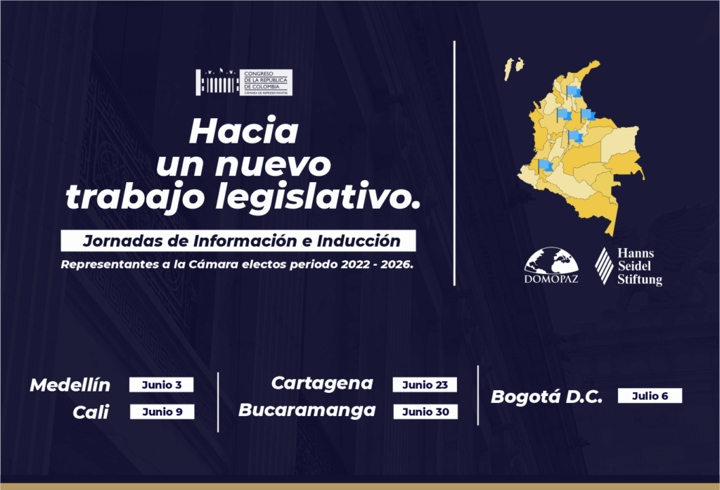 La mesa directiva de la Honorable Cámara de Representantes invitamos a todos los Nuevos Representantes a la Cámara, electos en 2022 a participar en las Jornadas de inducción, " HACIA UN NUEVO TRABAJO LEGISLATIVO 2022 - 2026" Estas Jornadas pretenden dar una visión integral de los procesos legislativos, administrativos y operativos de la Cámara de Representantes mediante el aporte de información directa y personalizada, fundamental para el nuevo trabajo legislativo a partir del próximo 20 de julio. Se llevarán a cabo en Medellín, Cali, Bucaramanga, Cartagena y Bogotá; donde estarán participando igualmente otros Honorables Representantes organizados de manera regional por departamentos, de acuerdo a los grupos focales y estan dirigidas a los Representantes que llegan por primera vez al Congreso de la República. Las jornadas de inducción son organizadas por la Secretaría General de la Cámara de Representantes, la dirección administrativa y la Fundación Domopaz con la cooperación de Alemania a través de Hanns Seidel Stiftung. Para mayor información y acreditación de los participantes; los y las interesados/as en participar de estas jornadas, pueden descargar el brochure informativo y comunicarse con el equipo organizador en: Ver: Brochure jornadas de inducción.pdf CÁMARA DE REPRESENTANTES Secretaría General. (601) 3904050 ext. 5144 - 5368 FUNDACIÓN DOMOPAZ (601)7258383 - 3208753408 contacto@domopaz.org Contacto directo Secretaria General: JIMENA RUEDA ANAYA o MARIA PATRICIA ARDILA Secretaría General tel: (601) 4325100 ext 5368 // 5144