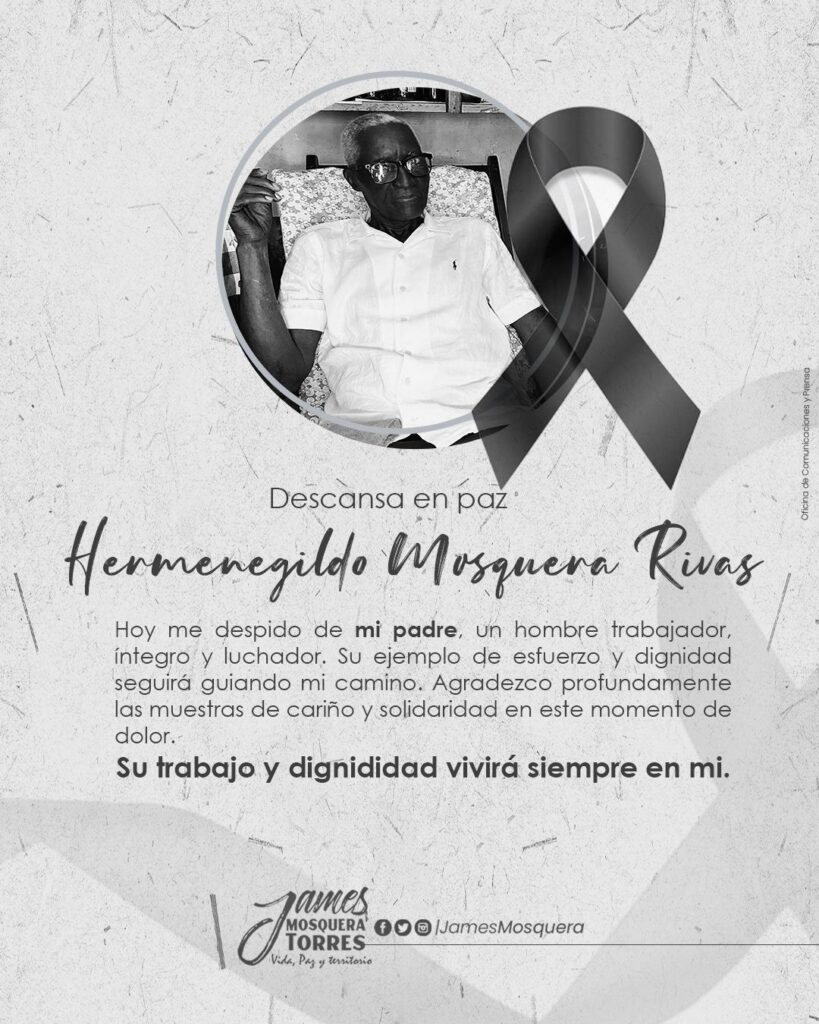 Con profundo pesar, lamentamos el fallecimiento de Hermenegildo Mosquera Rivas, un hombre cuya vida estuvo marcada por el servicio desinteresado, el compromiso con su comunidad y el amor profundo por el Chocó. Bogotá, 28 de mayo de 2025 (Prensa Cámara). Reconocido ampliamente por su liderazgo en la Defensa Civil, fue un referente de entrega y valentía, siempre al frente en los momentos más difíciles, extendiendo su mano solidaria a quienes más lo necesitaban. Además, su nombre quedó ligado para siempre a la tradicional balsámica, patrimonio cultural y medicinal de nuestra región, que ayudó a preservar con dedicación. Hermenegildo fue también un servidor incansable del pueblo de Istmina, donde su legado vive en cada gesto de gratitud, en cada historia compartida y en el respeto que se ganó a lo largo de toda una vida de trabajo honesto. “Hoy no solo despido a mi padre, despido a un hombre que amó profundamente al Chocó y lo sirvió con el alma. Su legado de dignidad, trabajo y solidaridad seguirá guiando mis pasos y los de quienes tuvimos el honor de conocerlo. Gracias, viejo querido, por enseñarnos a vivir con sentido y a servir con el corazón.” James Mosquera Torres, Representante a la Cámara Curul de Paz Chocó/Antioquia. Agradezco de manera sincera a todas las personas, instituciones y organizaciones que han expresado su cariño y solidaridad en este momento de duelo. Su compañía nos reconforta y honra la memoria de quien vivió para servir. Fuente: Prensa Representante James Mosquera Torres – Curul de Paz Chocó y Antioquia