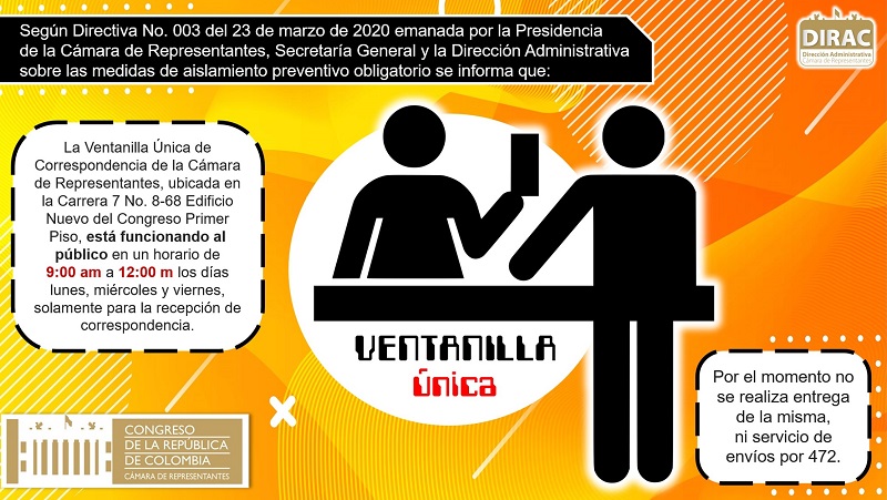 "Según Directiva No. 003 del 23 de marzo de 2020 emanada por la Presidencia de la Cámara de Representantes, Secretaría General y la Dirección Administrativa sobre las medidas de aislamiento preventivo obligatorio se informa que: La Ventanilla Única de Correspondencia de la Cámara de Representantes, ubicada en la Carrera 7 No. 8-68 Edificio Nuevo del Congreso Primer Piso, está funcionando al público en un horario de 9:00 am a 12:00 m los días lunes, miércoles y viernes, solamente para la recepción de correspondencia. Por el momento no se realiza entrega de la misma, ni servicio de envíos por 472."