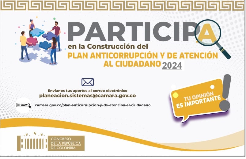 La Cámara de Representantes invita a la ciudadanía a participar en la construcción del Plan Anticorrupción y de Atención al Ciudadano para el 2024. Envíe sus aportes a través del correo institucional: planeación.sistemas@camara.gov.co Para nosotros es de suma importancia conocer su opinión y sugerencias con el propósito de continuar mejorando en temas relacionados con transparencia y acceso a la información. Recuerde que usted tiene el derecho de hacer seguimiento a la gestión de las entidades públicas. El Plan Anticorrupción y de Atención al Ciudadano, forma parte del Modelo Integrado de Planeación y Gestión, el cual se encuentra articulado al quehacer de las entidades públicas. Ver video informativo AQUÍ