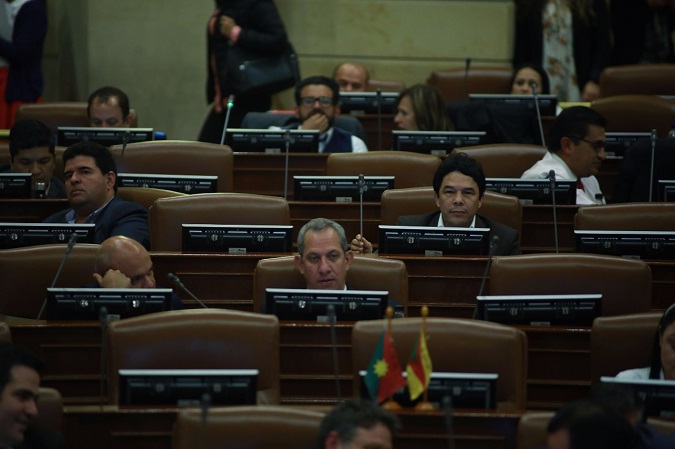 Fuente: Oficina de Imformación y Prensa Cámara de Representantes. La iniciativa, plasmada en el Acuerdo de Paz, tiene como objetivo otorgar estas curules a líderes sociales, campesinos y víctimas de la violencia, lo que ha generado temor entre algunos congresistas que aseguran que esas sillas, todas en la Cámara de Representantes, van a ser para afiliados de las Farc. “Esto es una gran mentira, menos del 34 por ciento de las víctimas no están en estas zonas, hay aumento de cultivos de coca, presencia de disidencias de Farc, bandas criminales y minería criminal… todo esto genera un caldo de cultivo perfecto para que sean las Farc las que terminen adquiriendo estas curules”, dijo Santiago Valencia. El proyecto, de origen gubernamental, recoge 167 municipios de departamentos como Guajira, Putumayo, Magdalena, Cesar y Antioquia, entre otros. Allí, líderes y representantes de organizaciones sociales, que estén reconocidos como víctimas, podrán aspirar a esos puestos. Para varios parlamentarios el riesgo radica en que los aspirantes en esas zonas sean fichas políticas de las desmovilizadas Farc, de narcotraficantes o de bandas criminales. Sobre esa hipótesis es que la bancada del Centro Democrático basó su oposición al Gobierno y, en general, al acuerdo pactado en Cuba. “Esto es una farsa”, dijo Álvaro Hernán Prada, quien sorprendió a la plenaria con dos figuras de cartón de ‘Timochenko’ e ‘Iván Márquez’. El proyecto de acto legislativo también contempla que los aspirantes a estos escaños deben ser residentes en la región y representativos del sector rural y solo pueden ser inscritos por organizaciones sociales, de campesinos, de ciudadanos o de víctimas. Estos territorios especiales de paz, de ser aprobados, entrarían a regir a partir del 2018 y se prolongarían hasta el 2026. Para Argenis Velásquez, liberal del Putumayo, “la paz merece una oportunidad” y el Estado debe garantizar que esas 16 sillas sean para las verdaderas víctimas de la violencia. El conservador Luis Horacio Gallón, por su parte, propuso que quienes aspiren a estas curules deben haber estado inscritas en las estadísticas de víctimas “con cinco años de anticipación y no con uno ni dos años”. Entre tanto, representantes como Orlando Guerra, del Putumayo, y Pablo Alba, de Guainía, alegaron porque de sus departamentos fueron excluidos varios municipios que padecieron las inclemencias de la guerra. En el mismo sentido lo hicieron los congresistas Alfredo de Luque, de la Guajira, y Eduardo Díaz Granados, del Magdalena, ambos de La U. Sus propuestas de incluir nuevos municipios en estos territorios especiales de paz fueron hundidas. “Las Circunscripciones Transitorias Especiales de Paz contarán con reglas especiales para la inscripción y elección de candidatos. Las campañas contarán con financiación especial y acceso a medios regionales”, reza en el articulado de la iniciativa. Así mismo se “desarrollarán mecanismos especiales de acompañamiento para asegurar la transparencia del proceso electoral y la libertad del voto del electorado”. La discusión del proyecto, que se prolongó por más de siete horas, poco a poco fue diezmando la presencia de representantes lo que obligó a proseguir el debate este miércoles. Los parlamentarios llamaron la atención del Gobierno y exigieron la presencia del ministro del postconflicto, Rafael Pardo. Para el presidente de la corporación, Rodrigo Lara, se avanzó en la discusión del proyecto y reiteró que la consigna es trabajar ante la premura del Fast Track.