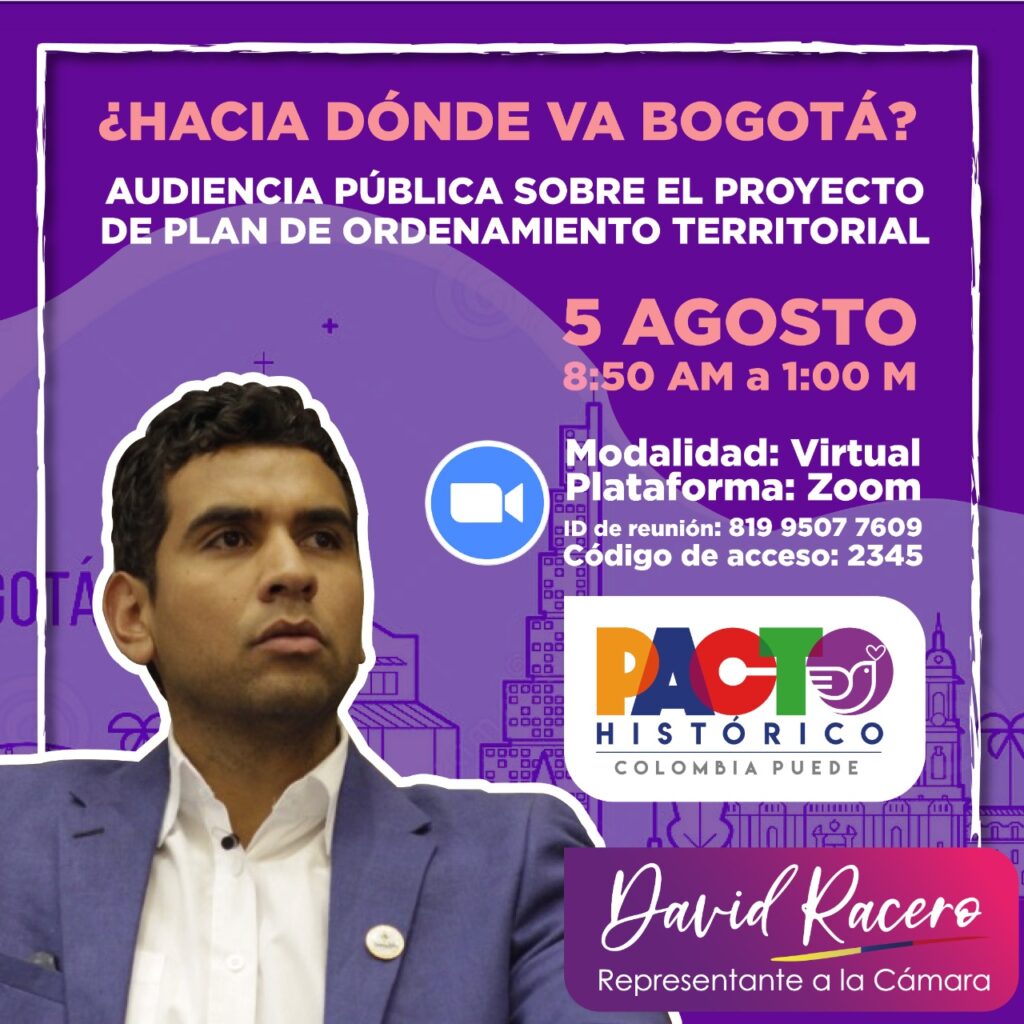 David Racero, Representante a la Cámara por Bogotá de la bancada del Pacto Histórico citó el próximo jueves, 5 de agosto, a autoridades distritales, expertos y comunidad en general, a una audiencia pública que busca analizar y escuchar perspectivas sobre el Proyecto de Acuerdo del Plan de Ordenamiento Territorial de Bogotá, el cual está actualmente en discusión ante el Consejo Territorial de Planeación Distrital. Luego de que el Plan de Ordenamiento Territorial presentado por la Administración Distrital de Peñalosa fuera hundido en el Concejo de Bogotá, la Alcaldesa Claudia López está apostando por presentar un nuevo Proyecto de Acuerdo que definirá la manera en que Bogotá se desarrollará en los próximos años. En este proyecto se abordarán temas trascendentales para la ciudad alrededor de la movilidad, planeación urbana, estructura ecológica, entre otros aspectos. Este espacio será liderado por el Congresista David Racero y estarán presentes las Concejalas de Bogotá por la bancada de Colombia Humana, los expertos Mauricio Betancourt García, Profesor de la Escuela Superior de Administración Pública – ESAP; Mónica Aldana, experta en Urbanismo; Javier Pava, experto en Gestión del Riesgo y Ordenamiento Territorial; María del Pilar Barrera, consejera local de Planeación; Cesar Augusto Ruiz, doctor en Ciencias Económicas, experto en Ordenamiento Territorial y representantes del Consejo de Planeación Territorial y sectores sociales. Además, se contará con la presencia de delegados de las Secretarías de Planeación, Movilidad y Ambiente y un espacio abierto de participación ciudadana. La audiencia pública se llevará a cabo de manera virtual, a partir de las 8:50 a.m., a través de: Plataforma: Zoom ID de reunión: 819 9507 7609 Código de acceso: 2345 Los interesados en participar del evento podrán inscribirse en el siguiente enlace: https://forms.gle/MsbX6dzjZ4bVt3maA Contacto de Medios Marcela Moreno Jefe de Prensa H.R. David Racero 311 4534950