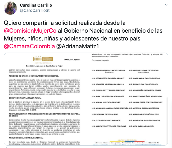 Quiero compartir la solicitud realizada desde la @ComisionmujerCo al Gobierno Nacional en beneficio de las Mujeres, niños, niñas y adolescentes de nuestro país
