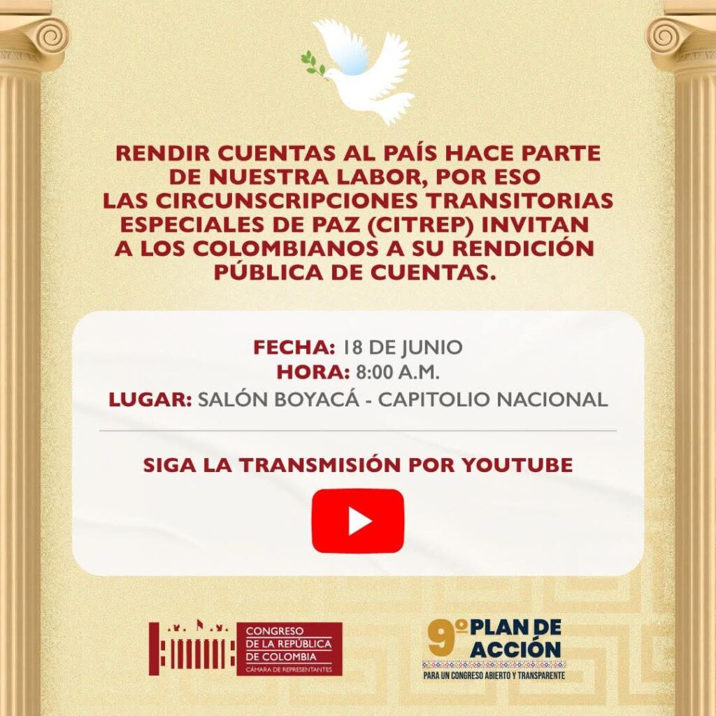 Los Representantes de la Curules de paz hacen una invitación especial Acompáñanos vía virtual en la transmisión de la rendición de cuentas de los Representantes CITREP. Queremos leer tus comentarios y conocer tu opinión desde el territorio. Como representante de las víctimas, para mí es fundamental contar con ustedes en este espacio de fuerza colectiva. ¡Los esperamos con el corazón abierto! 🧡✊🏾 🟠 https://www.facebook.com/share/p/1PExoBrqBk/?mibextid=wwXIfr 🟠 https://www.instagram.com/p/DLAfjm_MD_v/?igsh=b3B6NDA2cGF0cWZu 🟠 https://x.com/jamesmosquerat/status/1935025455955898844?s=46 Fuente: Prensa y comunicaciones HR James Mosquera Torres, Curul de Paz Chocó/Antioquia