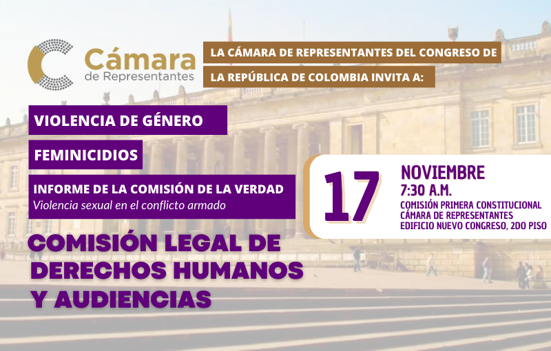 Desde 2016 hasta septiembre 2022 se han perpetrado 2.268 feminicidios en Colombia. De estas mujeres asesinadas el 40% estaban entre los 20 a los 29 años edad. Estas cifras alarmantes y lamentables nos impulsan a seguir avanzando hacia la prevención, la investigación, la sanción y la reparación de violaciones de los derechos humanos de las mujeres. El Estado debe actuar de manera articulada con la sociedad civil para que estos esfuerzos se traduzcan en la disminución de estas cifras y que como colombianos y colombianas lleguemos al entendimiento y a la eliminación de este fenómeno social tan doloroso. Por lo tanto se realiza la convocatoria a los Honorables Representantes integrantes de la Comisión de Derechos Humanos y Audiencias, además de las instituciones y organizaciones de la sociedad civil para abordar la situación de violencia de género en Colombia a la sesión ordinaria el día 17 de noviembre de 2022. Hora: 7:30 A.M . Lugar: Salón “Roberto Camacho” - Comisión Primera Cámara de Representantes, Edificio Nuevo del Congreso, Piso 2