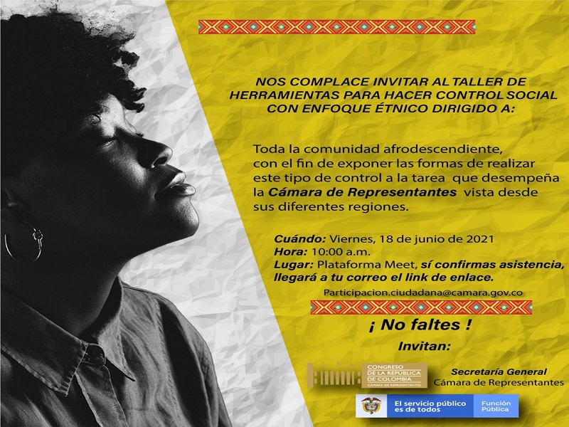 Esta es la oportunidad de aprender las herramientas necesarias para poder participar desde tu región! Sí perteneces a comunidades Afrodescendientes, te invitamos a este taller que contará con el apoyo del Departamento Administrativo de la Función Pública; creemos que sí todos entendemos que es control social podemos participar de manera más efectiva. Sí tienes alguna duda o quieres hacer parte de este evento, puedes escribir al correo: participacionciudadana@camara.gov.co Fuente: Secretaría General de la Cámara de Representantes