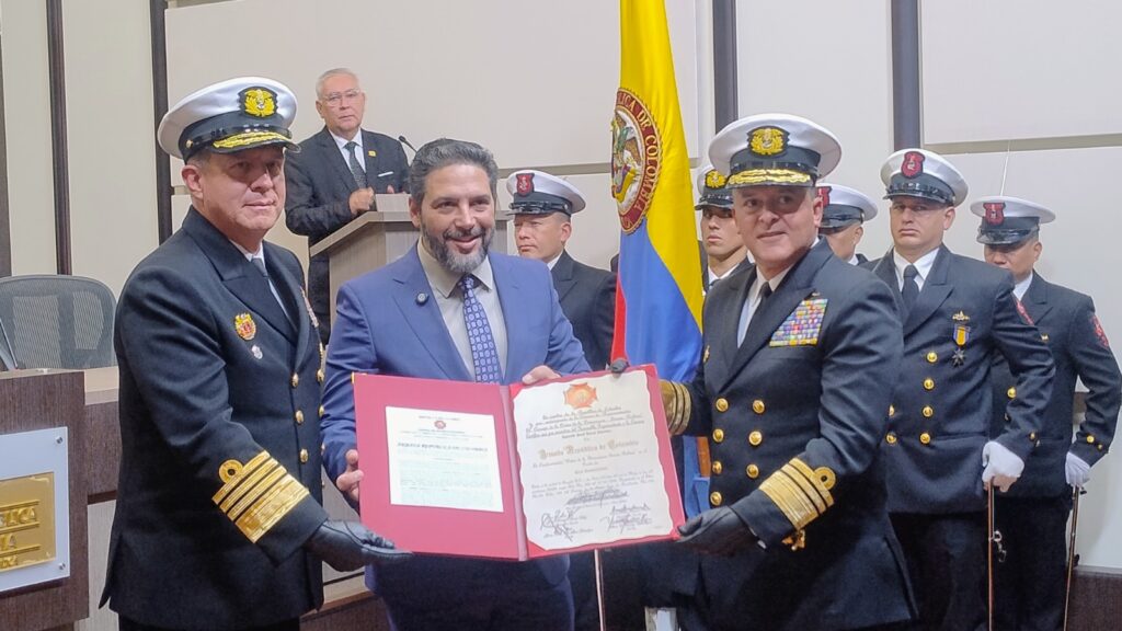 El Honorable Representante a la Cámara Dr. Agmeth Escaf Tijerino otorgó la Orden de la Democracia en el grado “Cruz Comendador” a la Armada República de Colombia por la conmemoración de 215 años de labor intachable, al legado histórico, a la valentía sin límites y a la entrega constante al servicio de la patria, simbolizando el profundo respeto y gratitud de una nación que confía en sus fuerzas armadas para proteger su soberanía y su futuro.