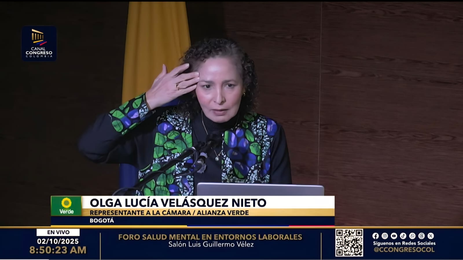 El 2 DE octubre del 2025. En el auditorio Luis Guillermo Vélez del edificio nuevo del Congreso, la Honorable Representante a la Cámara, Dra. Olga Lucia Velásquez Nieto dio inicio al Foro Salud Mental en Entornos Laborales.