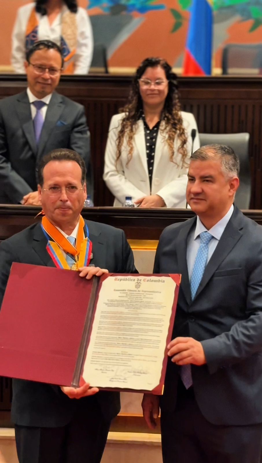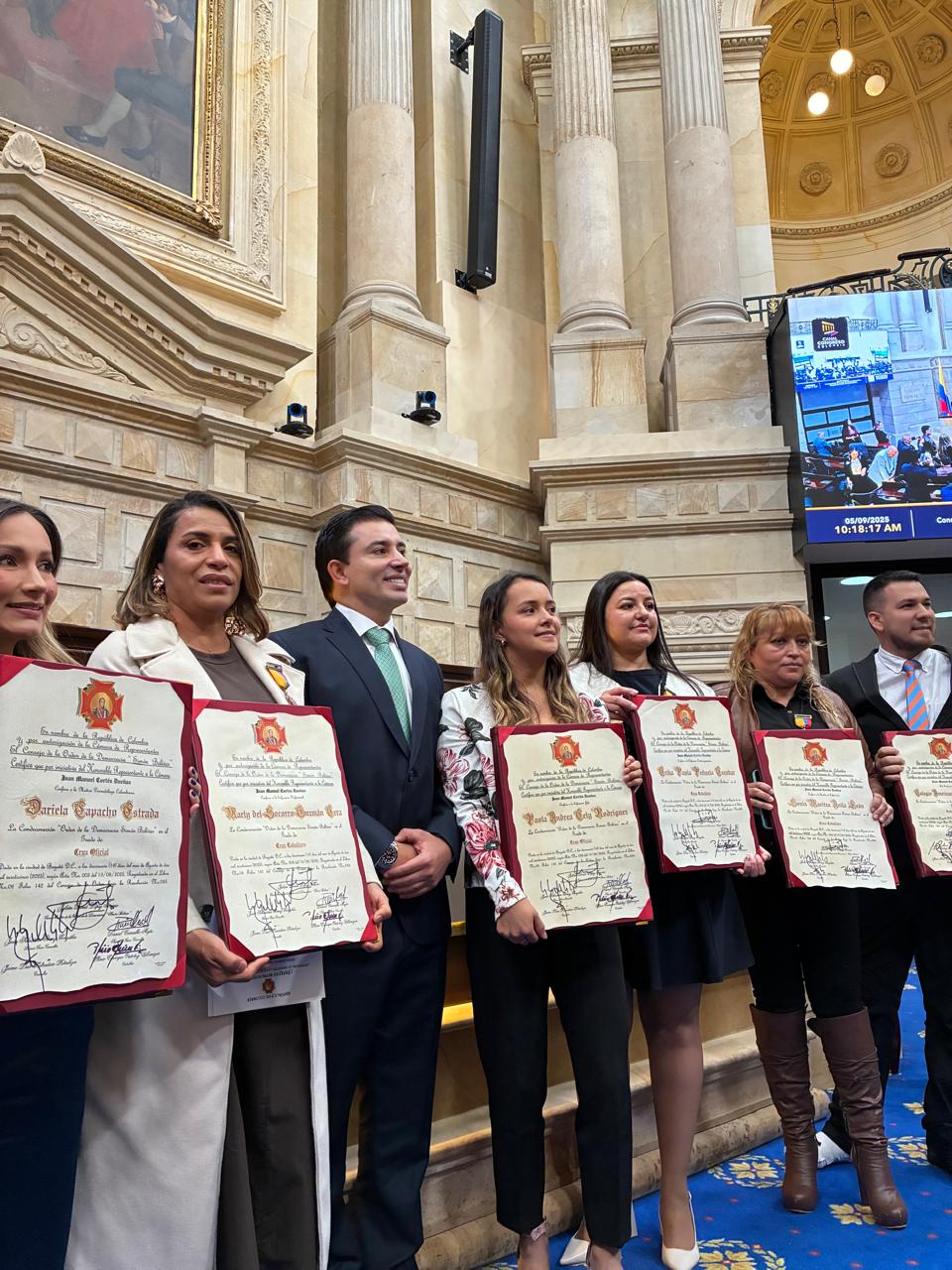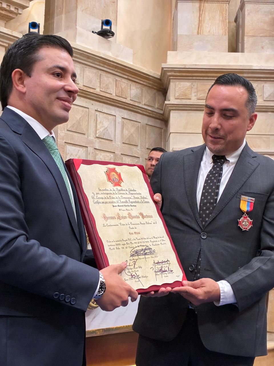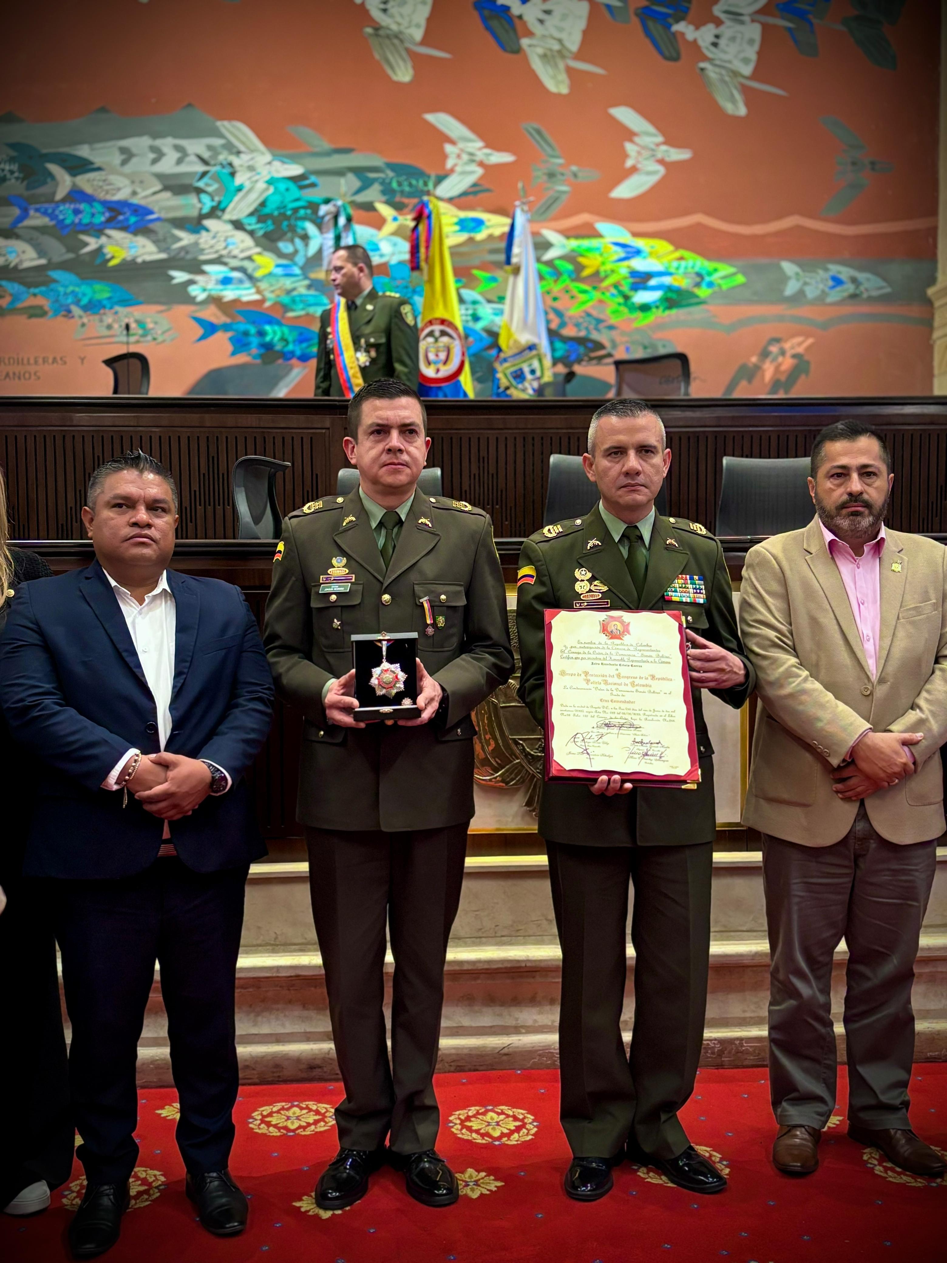Esta importante distinción fue recibida por el Coronel Joaquín Darío Medrano Muñoz, director de Protección y Servicios Especiales y esquema de seguridad de los Honorables Representantes, en reconocimiento a su invaluable labor de proteger y resguardar a los Honorables Congresistas y al Capitolio Nacional.